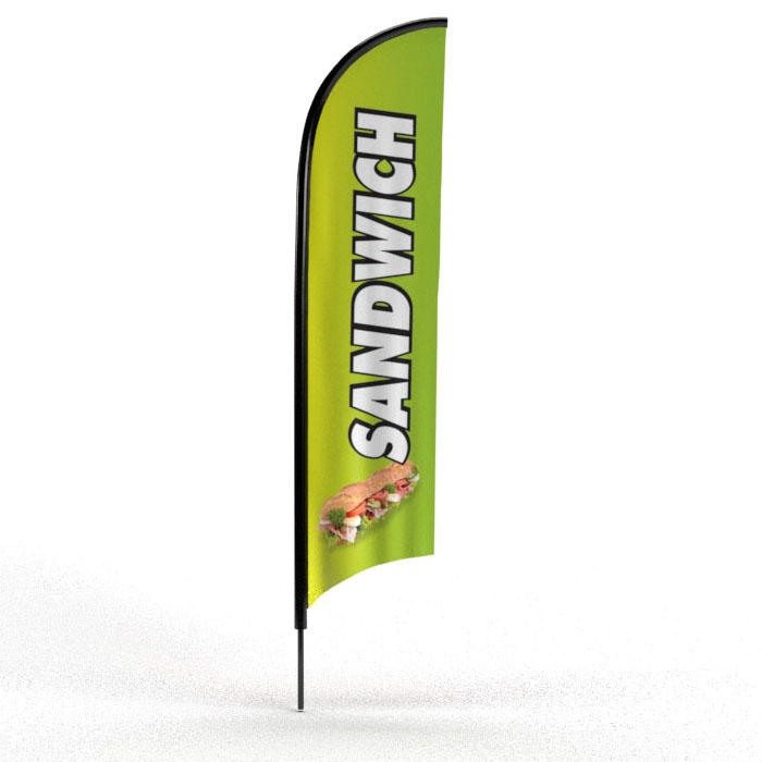 Visibilité Maximale : Dans une rue animée, ce drapeau se voit de loin. Ses couleurs vives et son message clair arrêtent les passants et leur indiquent où trouver une solution simple et savoureuse pour leur déjeuner.